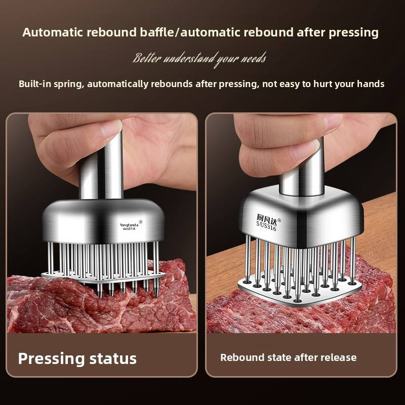 The beef tenderizer adopts a multi needle dense puncture structure, which can quickly cut off the coarse fibers and fascia inside the beef. It can significantly improve the softness and tenderness of the meat without long-term pickling, and can easily create a restaurant grade taste without clogging the mouth. It can make the seasoning penetrate into the meat faster, taste more evenly, shorten the pickling time, improve cooking efficiency, and is suitable for various meats such as steak, beef brisket, and pork chops.
